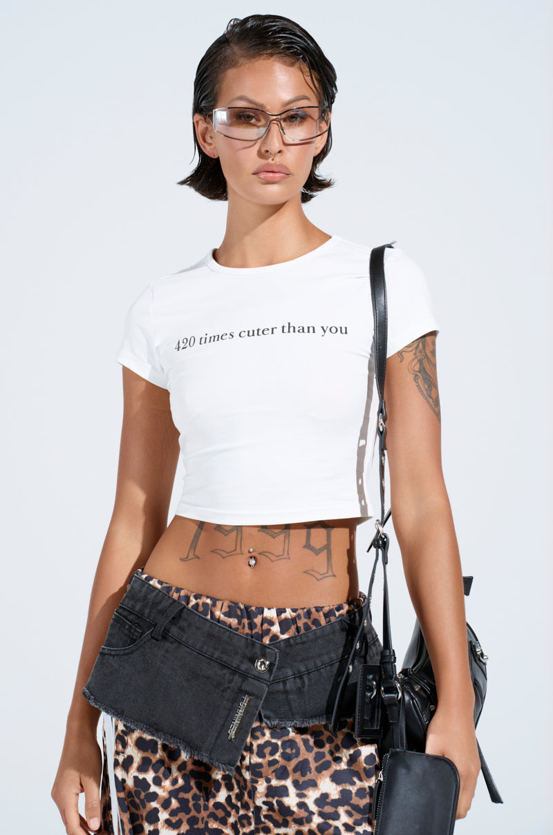 No lies here! The AKIRA Label 420 Times Cuter Than You Baby Tee is crafted from stretchy cotton and features a crew neckline. short sleeves. and a contrast “420 times cuter than you” graphic across the chest. Complete with a snug. cropped silhouette. and a pull-on fit. Pair with low-rise jeans. chunky sneakers. and a metallic shoulder bag for a sassy. adorable finish.