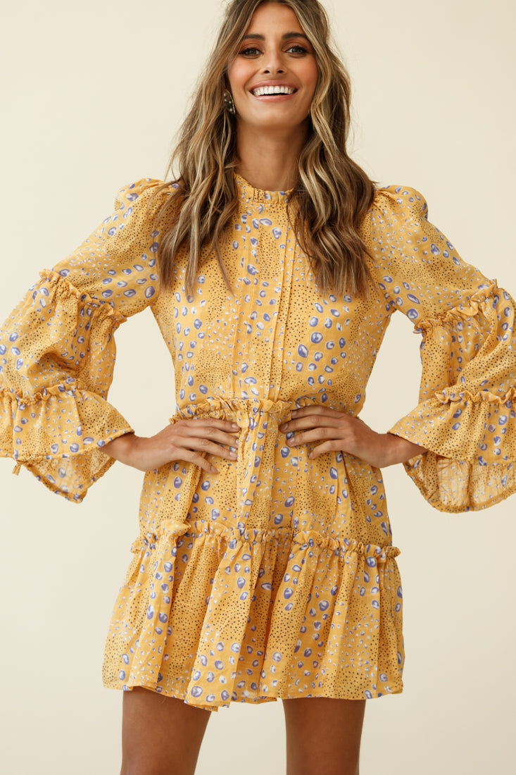 Beatrix High Neck Bell Sleeve Dress Droplet Print Yellow