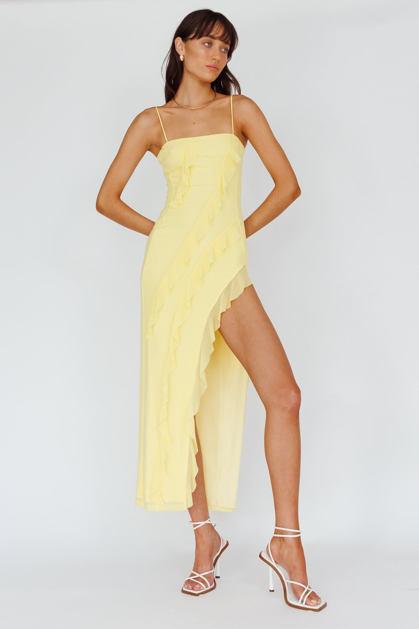 Make an entrance in our gorgeous Catriona midi dress. We are in love with its high thigh split in the side and on-trend ruffle detail. Perfect for a fun girls' night out teamed with strappy heels and a clutch.